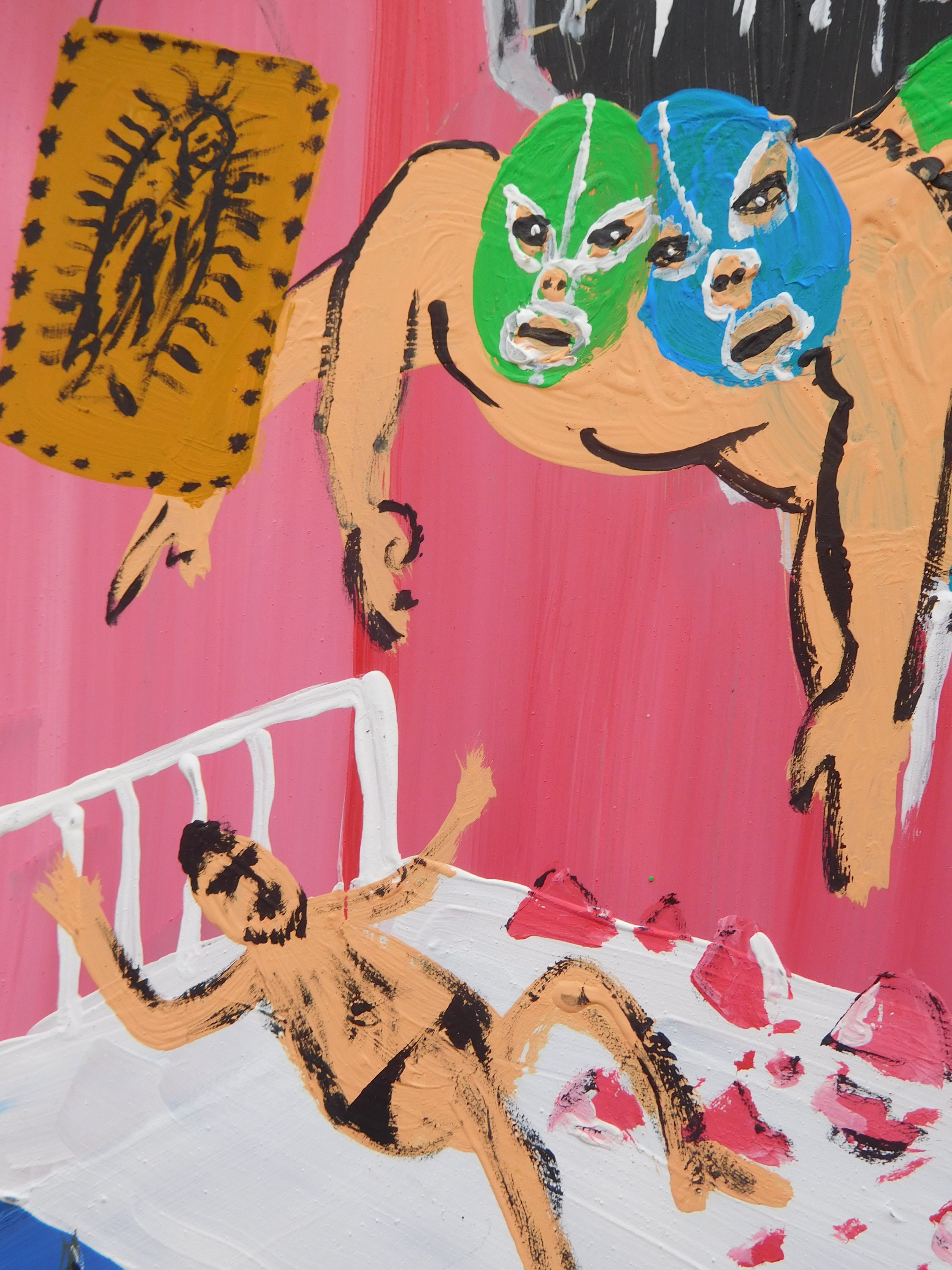 願いが叶ったことや災難困難から助けられたことを神へ感謝し、庶民が絵と言葉で描いた物です。カトリックの習慣で教会へ奉納していました。日本でいう願い事を書い納する「絵馬」に近いです。内容は家族、健康、仕事、人間関係の事など・・・描いた時代のメヒコの人々の暮らしに密着したものが多いです。近年は風刺画や絵日記としても親しまれています。教会付近のお土産屋さんや蚤の市でエクスボトに出会い、創作意欲が沸きメヒコの思い出と自分の身のまわりの出来事を重ね合わせてブリキ絵を描いてみました。
