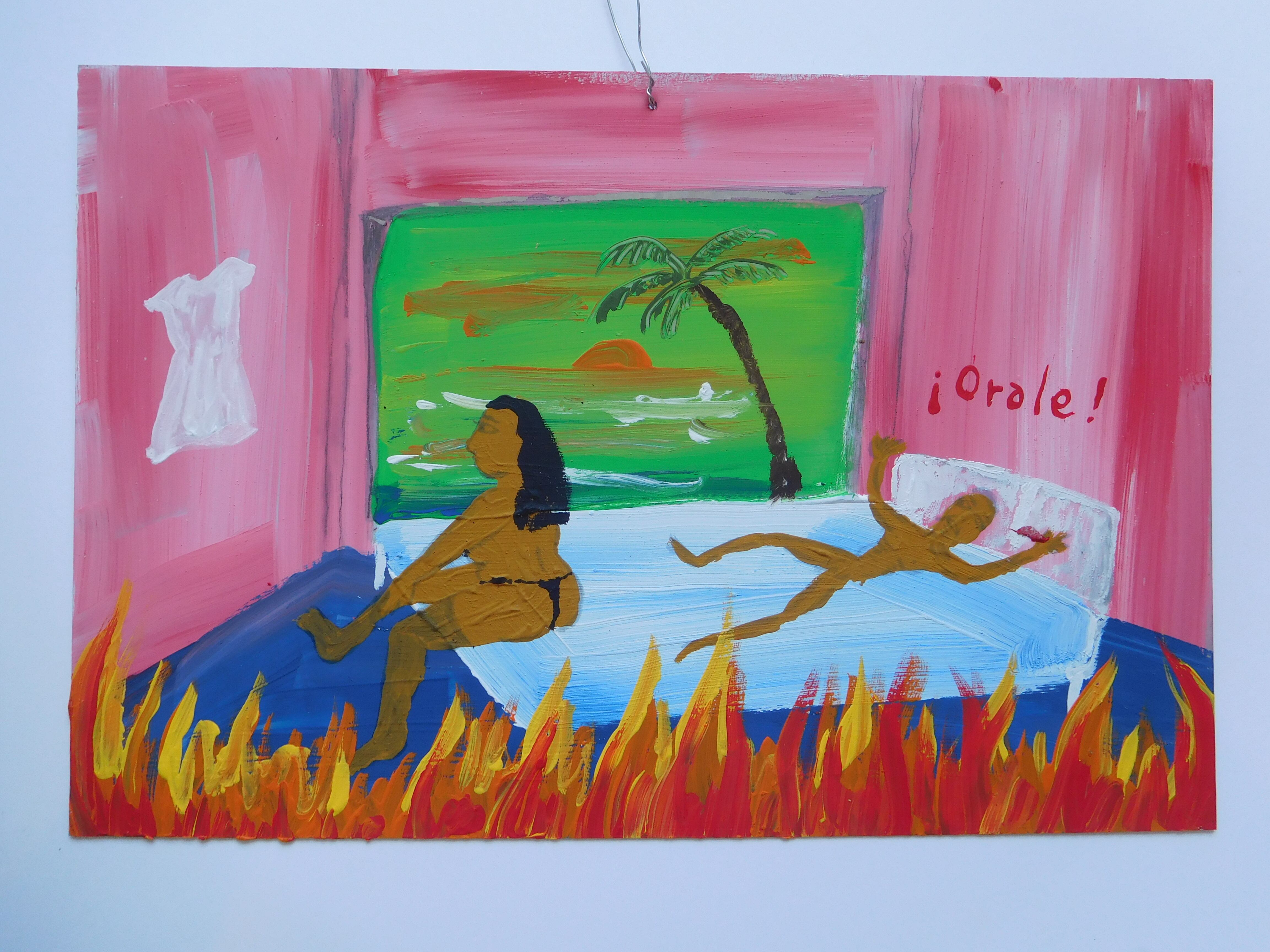 願いが叶ったことや災難困難から助けられたことを神へ感謝し、庶民が絵と言葉で描いた物です。カトリックの習慣で教会へ奉納していました。日本でいう願い事を書い納する「絵馬」に近いです。内容は家族、健康、仕事、人間関係の事など・・・描いた時代のメヒコの人々の暮らしに密着したものが多いです。近年は風刺画や絵日記としても親しまれています。教会付近のお土産屋さんや蚤の市でエクスボトに出会い、創作意欲が沸きメヒコの思い出と自分の身のまわりの出来事を重ね合わせてブリキ絵を描いてみました。