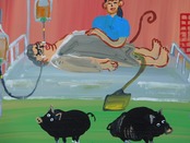願いが叶ったことや災難困難から助けられたことを神へ感謝し、庶民が絵と言葉で描いた物です。カトリックの習慣で教会へ奉納していました。日本でいう願い事を書い納する「絵馬」に近いです。内容は家族、健康、仕事、人間関係の事など・・・描いた時代のメヒコの人々の暮らしに密着したものが多いです。近年は風刺画や絵日記としても親しまれています。教会付近のお土産屋さんや蚤の市でエクスボトに出会い、創作意欲が沸きメヒコの思い出と自分の身のまわりの出来事を重ね合わせてブリキ絵を描いてみました。