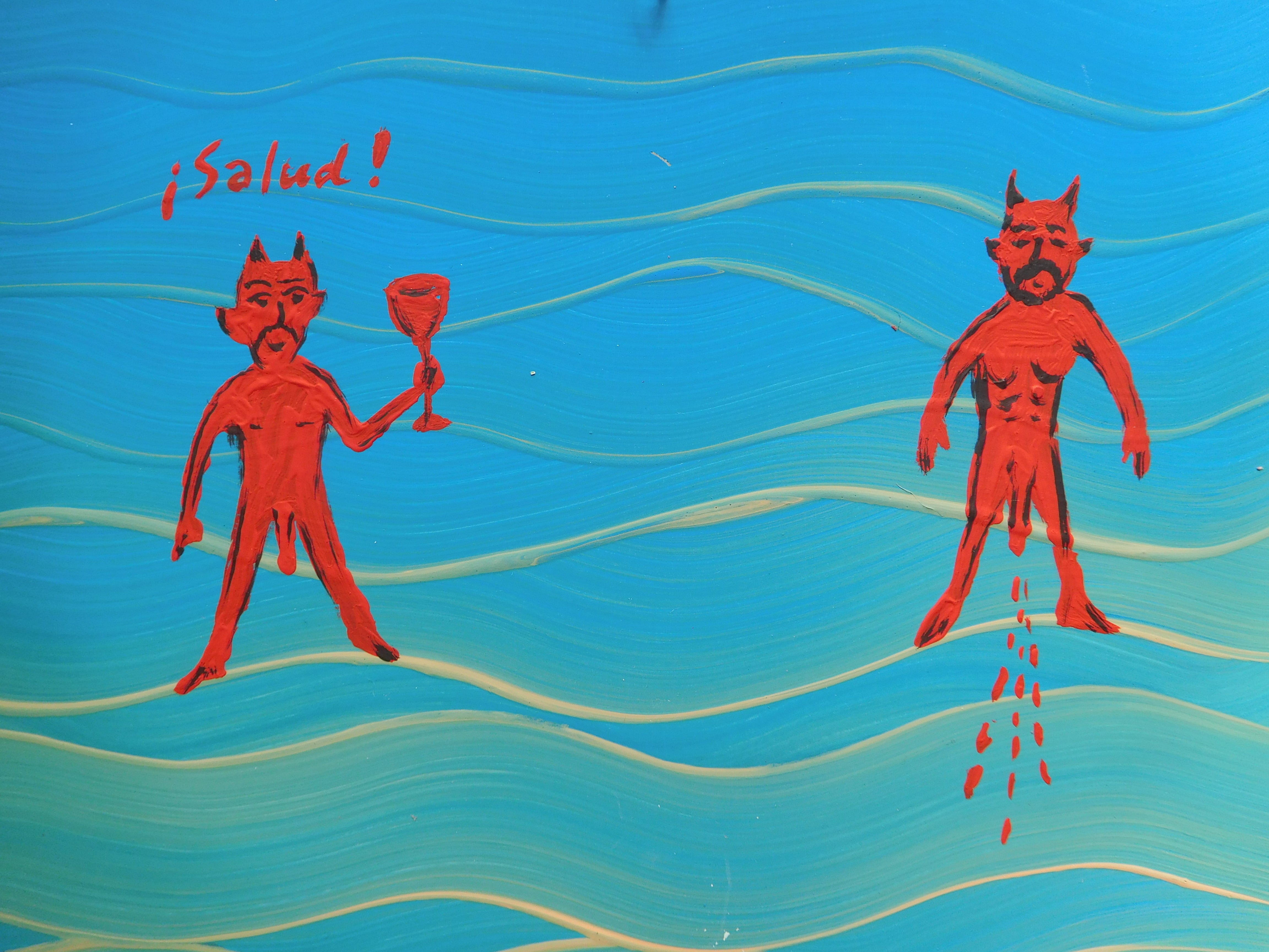 願いが叶ったことや災難困難から助けられたことを神へ感謝し、庶民が絵と言葉で描いた物です。カトリックの習慣で教会へ奉納していました。日本でいう願い事を書い納する「絵馬」に近いです。内容は家族、健康、仕事、人間関係の事など・・・描いた時代のメヒコの人々の暮らしに密着したものが多いです。近年は風刺画や絵日記としても親しまれています。教会付近のお土産屋さんや蚤の市でエクスボトに出会い、創作意欲が沸きメヒコの思い出と自分の身のまわりの出来事を重ね合わせてブリキ絵を描いてみました。